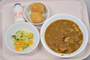 あきのこんさいカレー キャベツのあまずあえ ヨーク(おやつ)むぎちゃ おはぎ