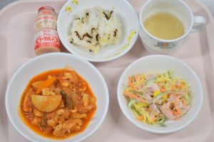 とりにくのトマトに スパゲティサラダ ヤクルト(おやつ)むぎちゃ しおこんぶごはん