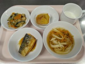 さばのかばやき なすのみそいため そうめんのすましじる(おやつ)ぎゅうにゅう こまつなとくりのカップケーキ