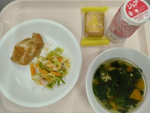 スパイシーチキン キャベツのゴマいりサラダ こまつなとたまごのスープ(おやつ)ジョア ビスケット