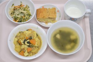 とうふカレーあんかけ ちゅうかサラダ おふのスープ(おやつ)ぎゅうにゅう ジャムケーキ