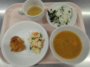 とりにくのマーマレードに おからでポテトサラダ はくさいのみそしる(おやつ)むぎちゃ わかめごはん(防災食)
