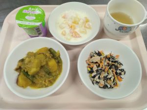 ぶたにくとさつまいものカレーに ひじきとツナのサラダ ゼリー(おやつ)むぎちゃ あまざけフルーツヨーグルト
