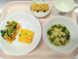 チーズオムレツ やさいのカレーマリネ じゃがにらスープ(おやつ)ぎゅうにゅう レーズンスティック