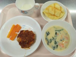 にこみハンバーグ にんじんのグラッセ とうにゅうコーンスープ(おやつ)ぎゅうにゅう メロンパン