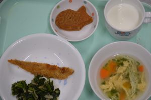 ししゃもフライ ほうれんそうのおかかあえ はるさめのかきたまスープ (おやつ)ぎゅうにゅう ミニたいやき
