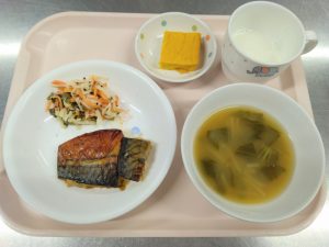 さばのカレーふうみやき ゆたかあえ ちんげんさいともやしのみそしる(おやつ)ぎゅうにゅう かぼちゃのチーズケーキ