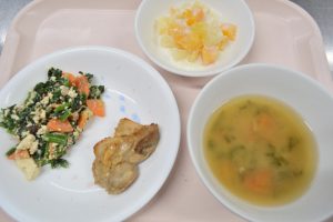 とりにくのさっぱりに あおなのしらあえ えのきのみそしる(おやつ)むぎちゃ あまざけフルーツヨーグルト