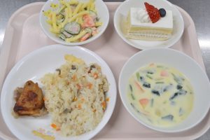 シーチキンピラフ ローストチキン マカロニサラダ コーンスープ (おやつ)むぎちゃ ケーキ