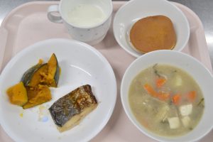 さわらのゆずかおりやき かぼちゃのグラッセ とんじる(おやつ)ぎゅうにゅう どらやき
