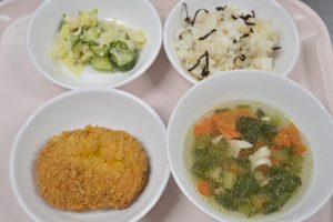 かぼちゃコロッケ キャベツのみそダレサラダ きのこスープ(おやつ)むぎちゃ しおこんぶごはん