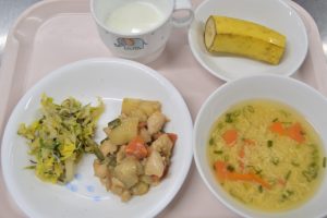 とりにくのあげに はくさいののりあえ かきたまみそしる(おやつ)ぎゅうにゅう バナナ