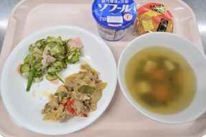 やきにく ハムとらっきょうのサラダ おふのスープ(おやつ)むぎちゃ ヨーグルト せんべい