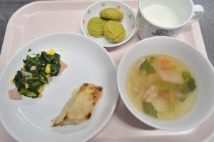 さかなのみそマヨネーズやき ほうれんそうとハムのおかかあえ かぶのスープ(おやつ)ぎゅうにゅう