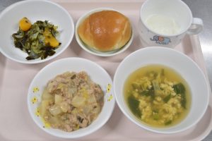 マーボーだいこん きゅうりのあまずあえ ちゅうかスープ(おやつ)ぎゅうにゅう ロールパン