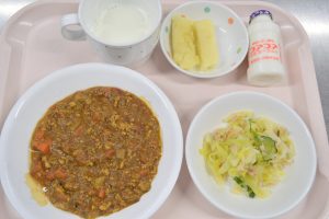とりにくとこんさいのカレー キャベツとツナのサラダ ヨーク(おやつ)ぎゅうにゅう チーズインスティックポテト