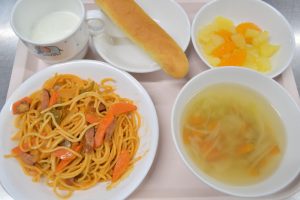 スパゲッティナポリタン キャベツのスープ フルーツコンポート(おやつ)ぎゅうにゅう スティックパン