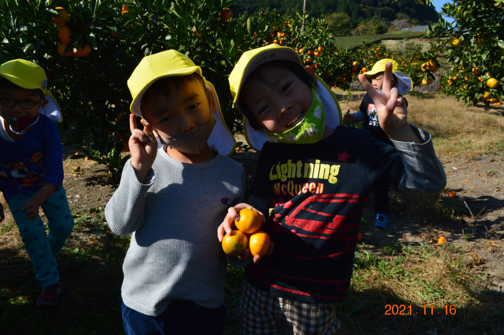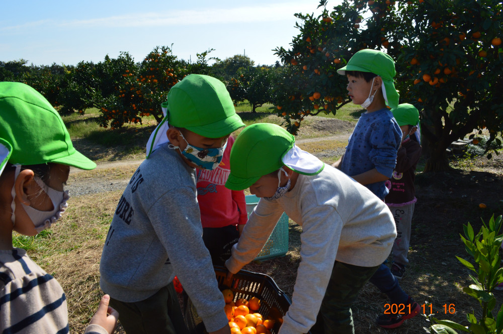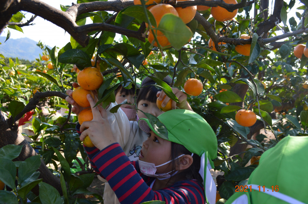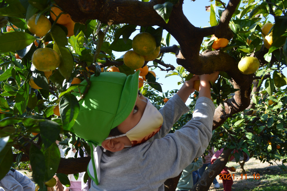 木になっているたくさんのみかんを、目を輝かせながら、必死に取っていました。小粒ではありますが、酸味と甘みのバランスが良く味は上等です。全園児おうちに持ち帰ります。是非、ご家族でご賞味ください。