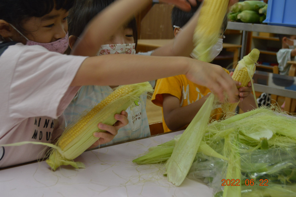 社会福祉法人聖母福祉会 藤枝聖マリア保育園 > お知らせ > イベント > とうもろこしの皮むきをしたよ!