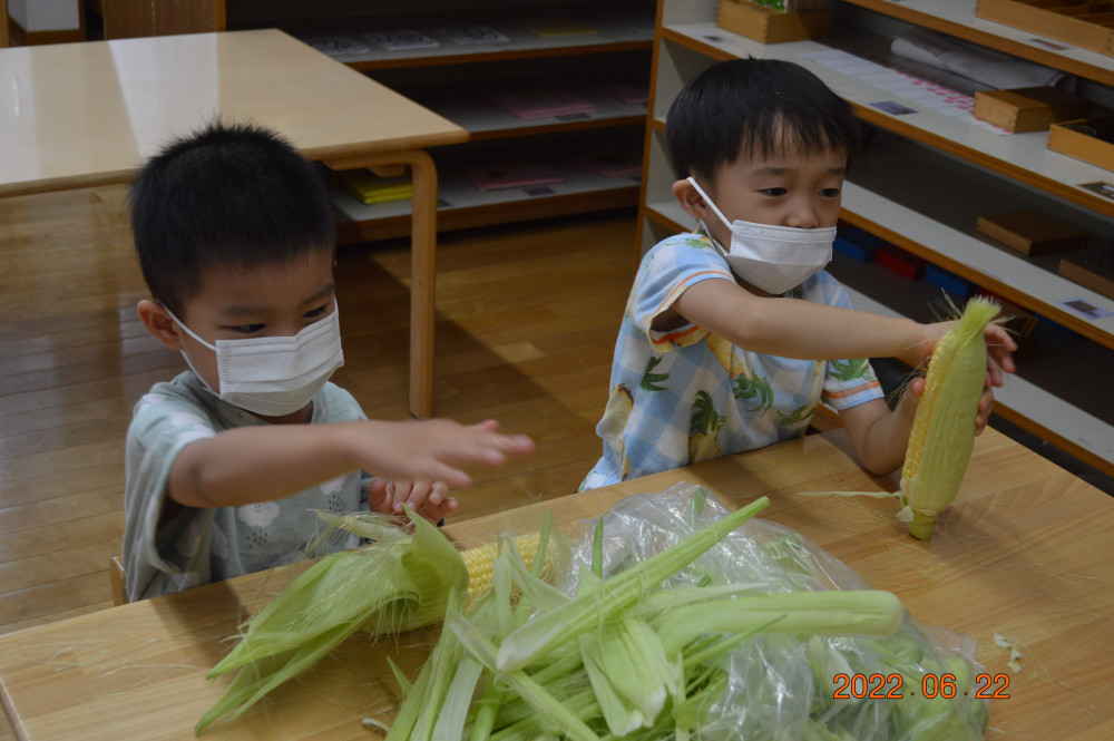 6月22日(水) とうもろこしの皮むきを4歳児ヨゼフ組の子ども達が手伝ってくれました。ひげがいっぱいついてたね。あのひげは、「めしべ」で絹糸(けんし)と呼ばれる、トウモロコシの実が詰まる役目をする大切なもの。だから、トウモロコシの粒と同じ数のひげがあるんだって。おやつには甘くておいしいともろこしをいただきました。