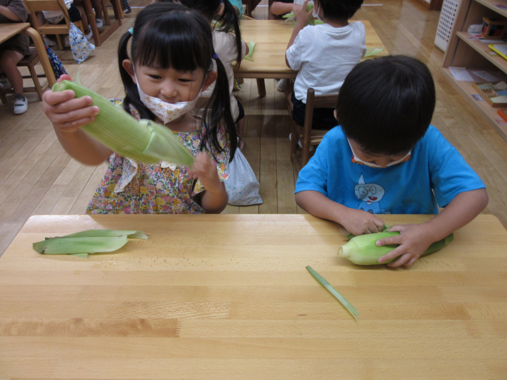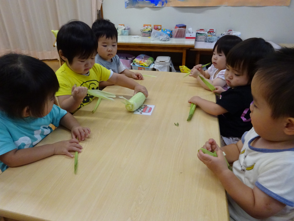 今日は1歳児たんぽぽ組・3歳児てんし組の子ども達が、おやつのとうもろこしの皮をむいてくれました。皮やひげの感触、びっしり詰まった実のつき方にとても興味があるようで、何度も何度も手で触りながら皮をむいていましたよ。おやつにはみんなでおいしくいただきました。