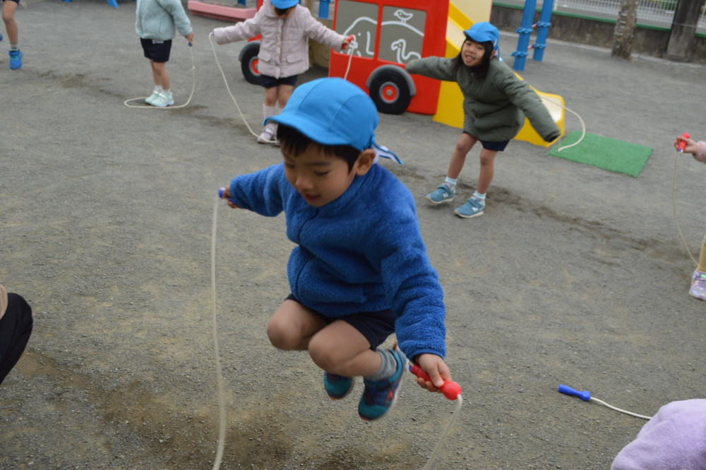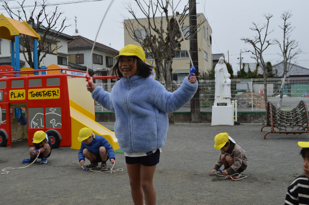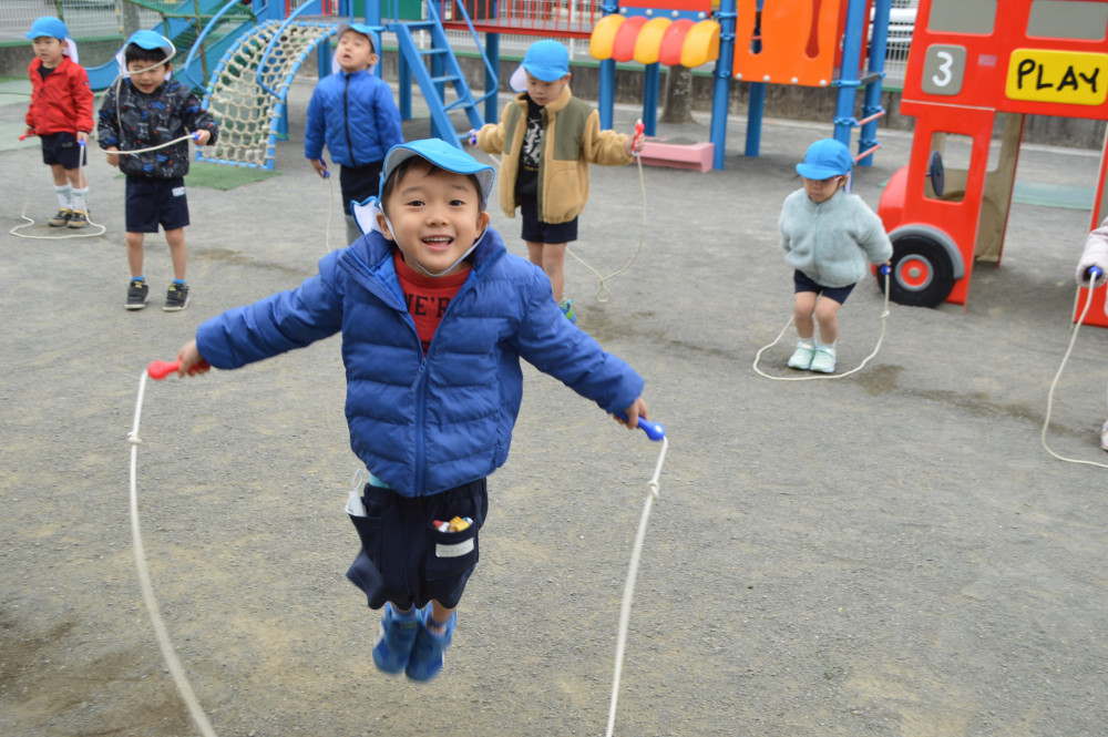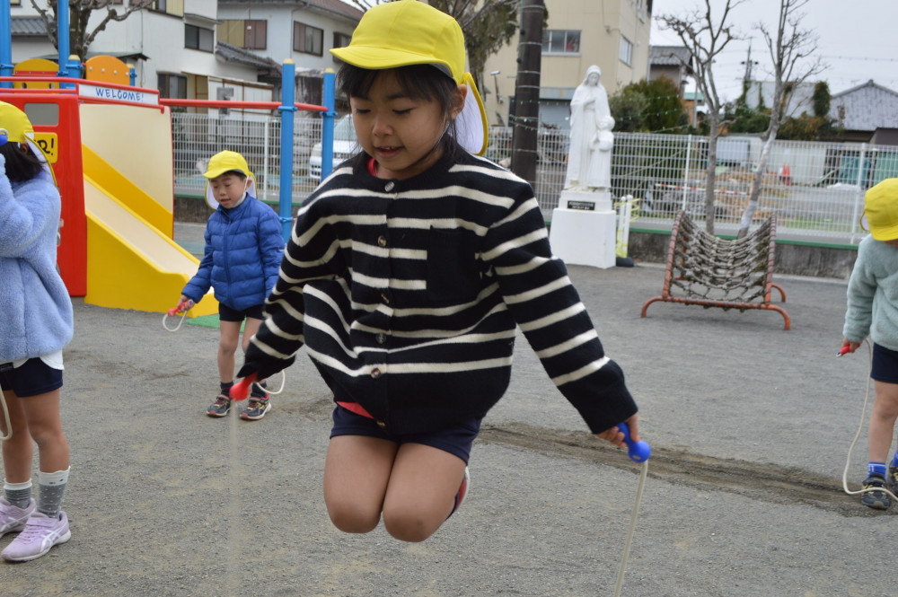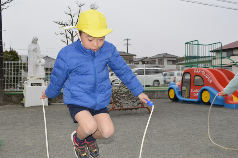 今日は、てんし・ヨゼフ・マリア組の子ども達のなわとび大会。園庭に出たばかりの時には、子ども達も「さむ~い‼」と口々に言っていましたが、なわとび大会が始まると、体がポカポカするくらい、一生懸命跳んでいました。どの子も自分の目標に向かって、「がんばる‼」その気持ちに満ち溢れていましたよ。