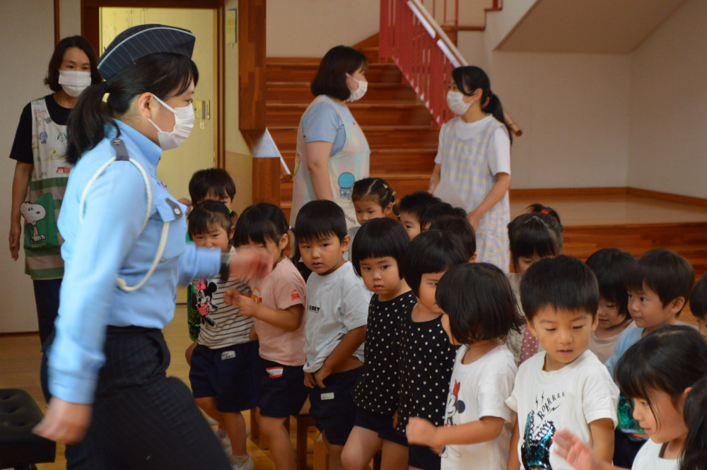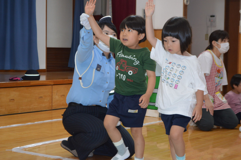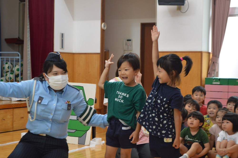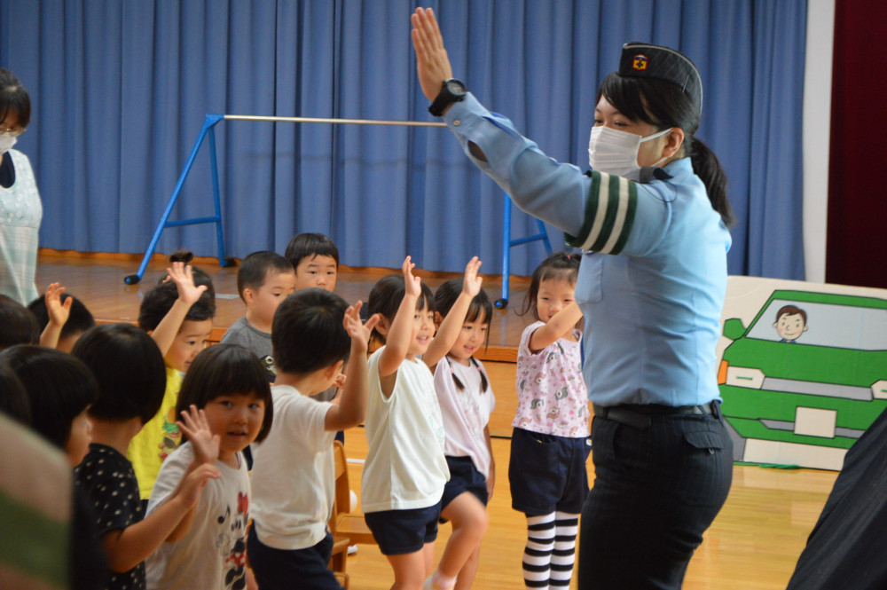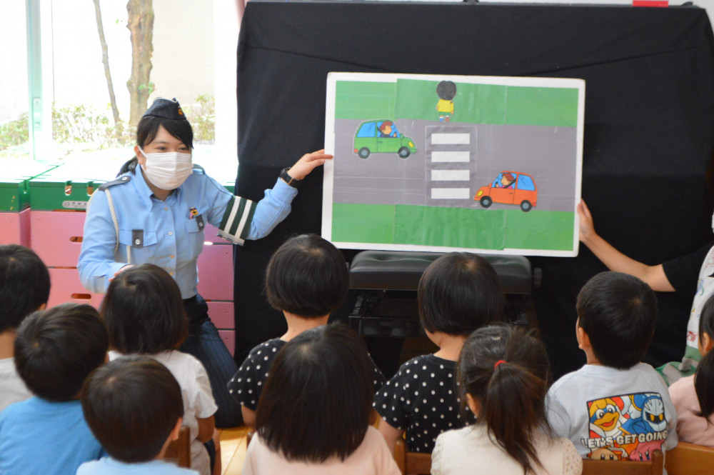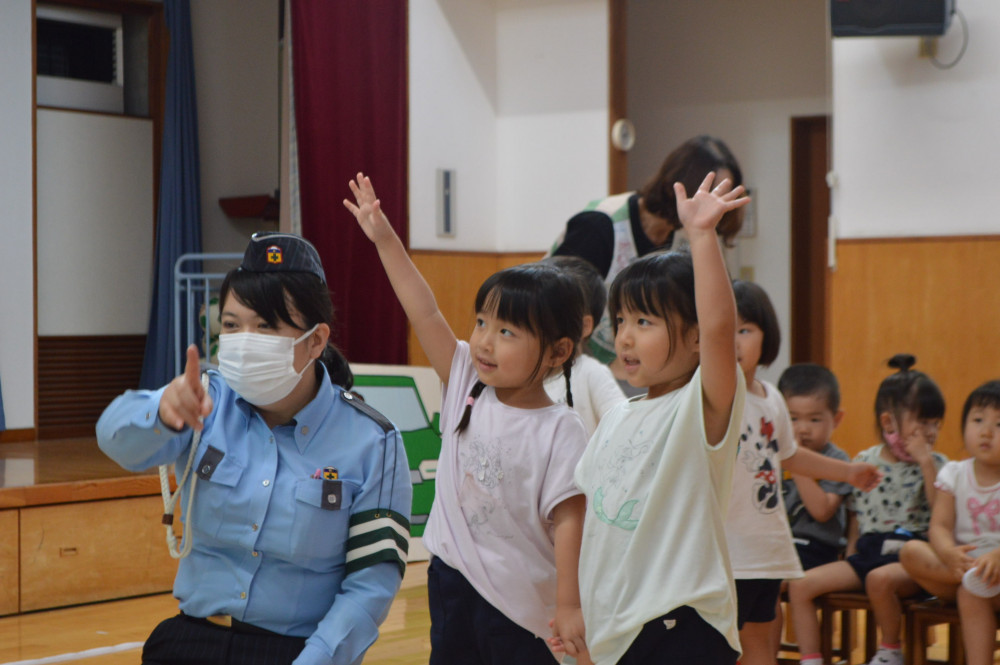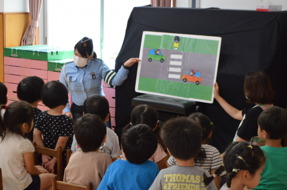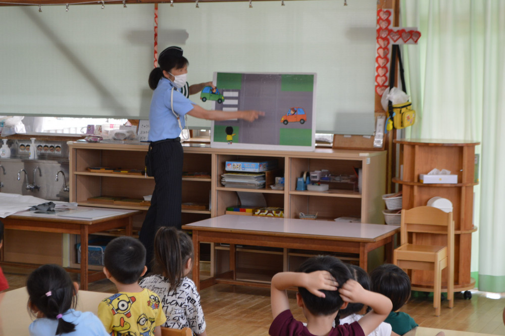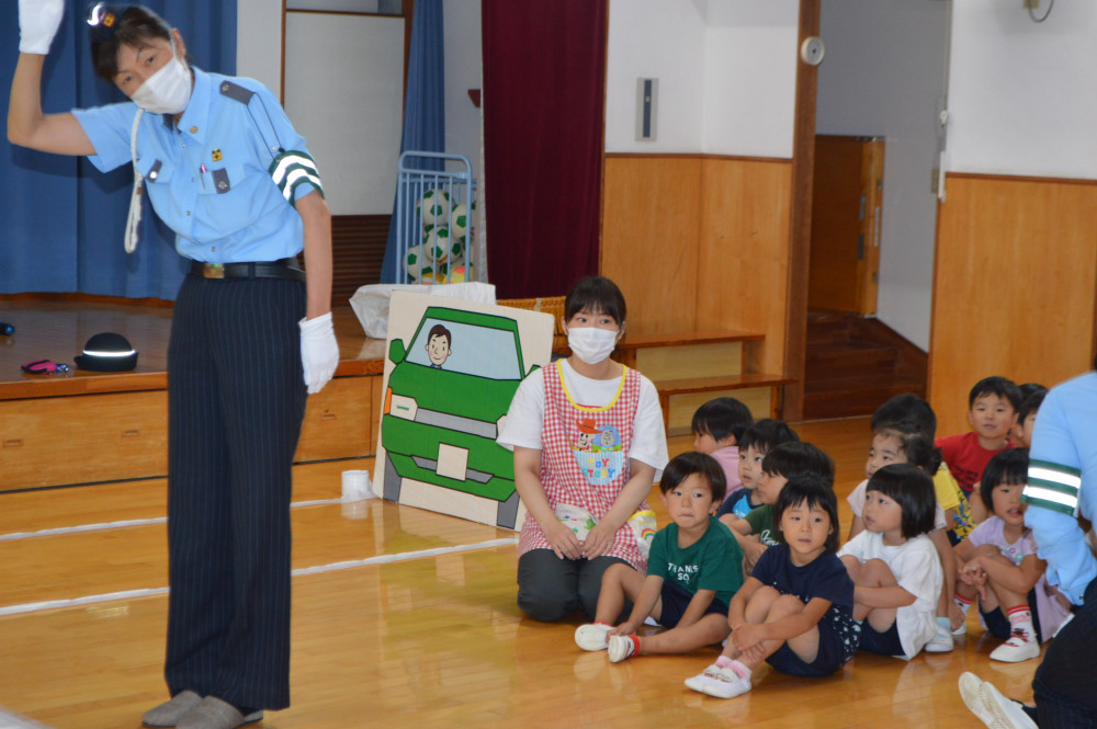 今日は、てんし組、ヨゼフ組、マリア組の子ども達が、藤枝警察署の交通指導員の方々から、道路の歩き方、渡り方、信号の見方など交通安全についてたくさん教えていただきました。