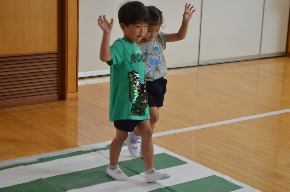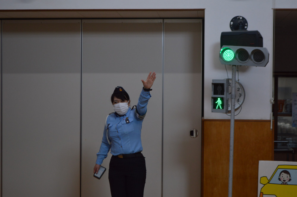 車の人に良く見えるように手を上げて、右、左、もう一度右、後ろも車が来ていないかよく確認することなどのお話をしていただきました。てんし組とヨゼフ組の子ども達は、ホールに設置された信号機や横断歩道を使って、少し緊張しながらも教えていただいた通り、信号機を見ながら上手に渡ることが出来ていました。