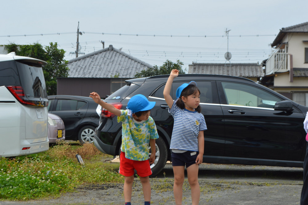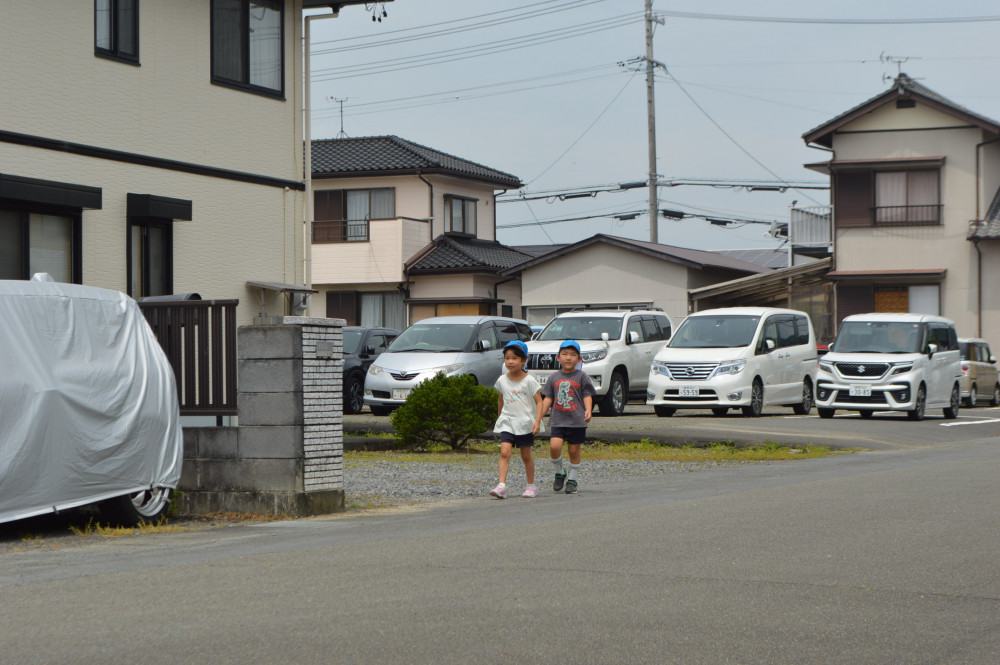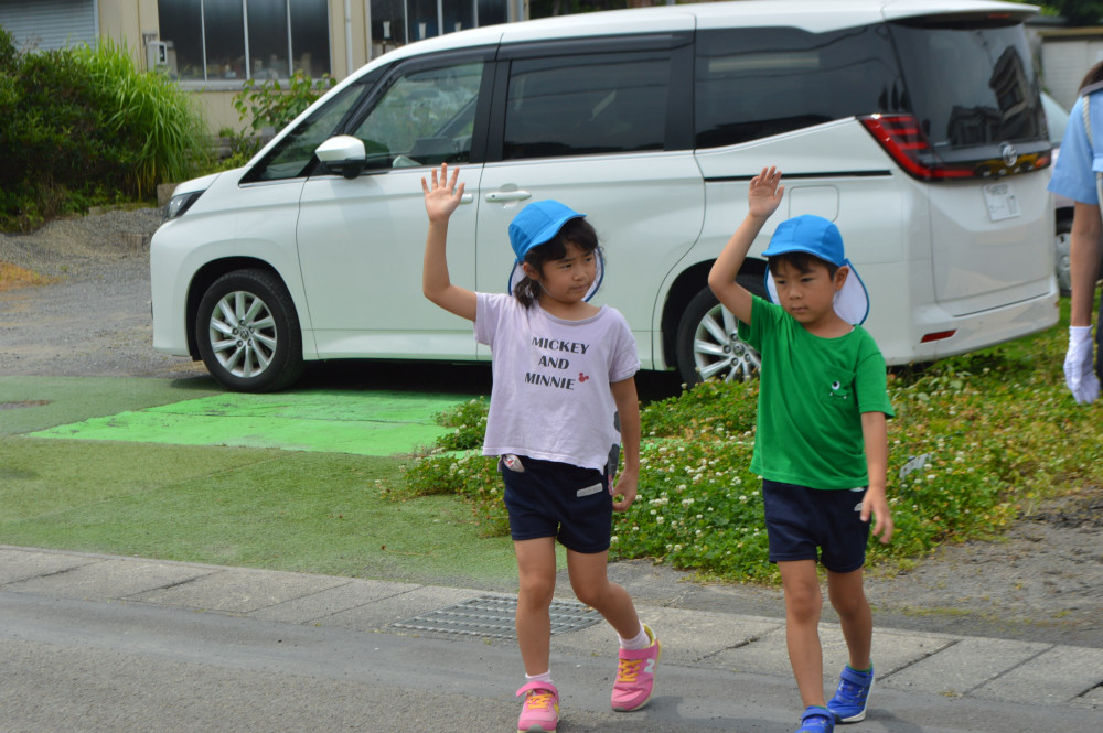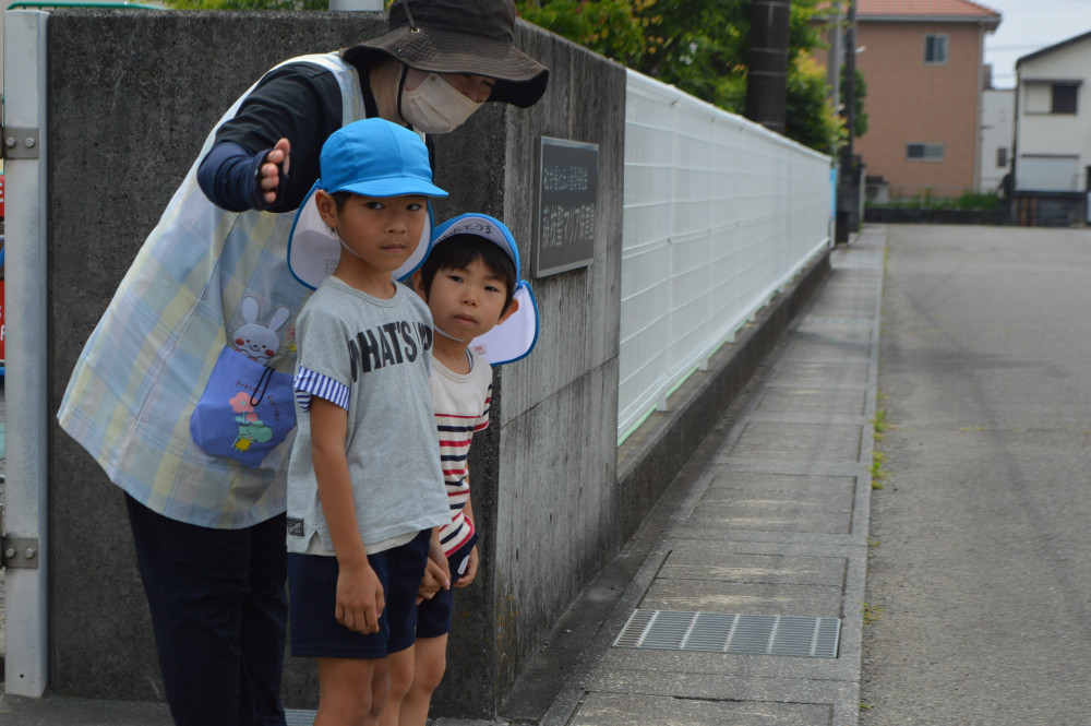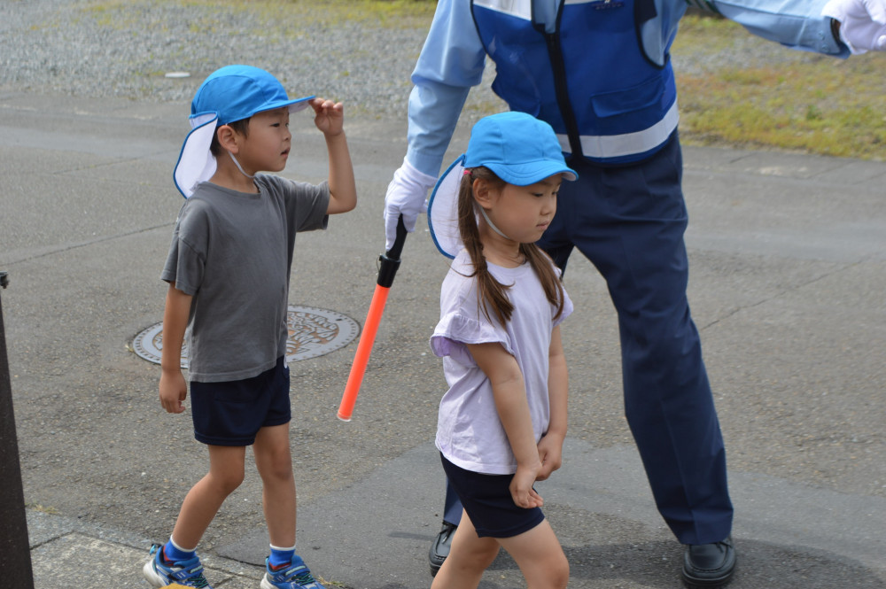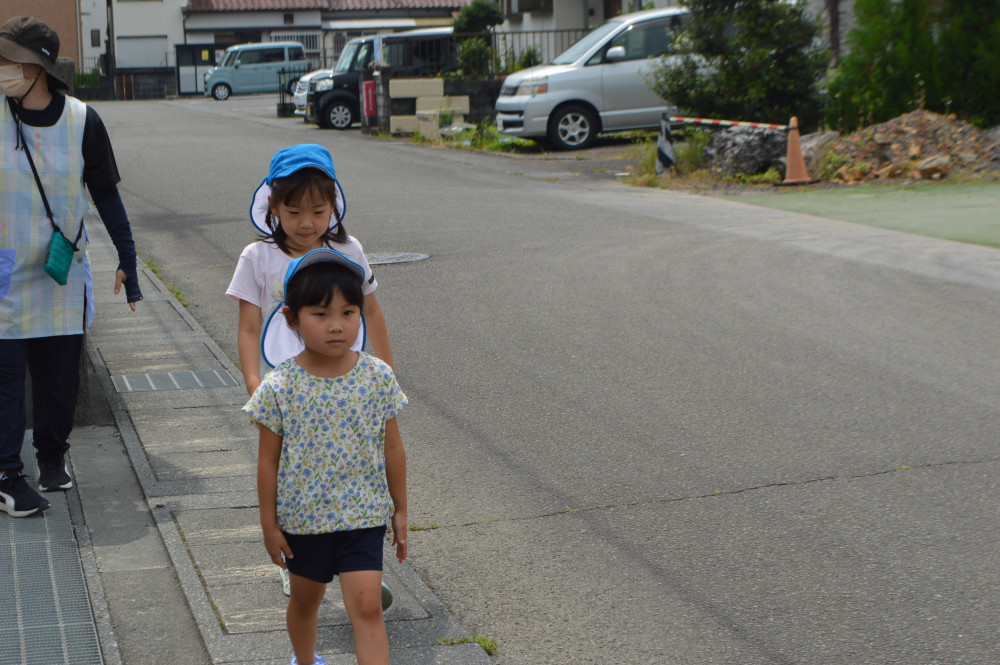 マリア組の子ども達は、地域の交通安全協会の方々にもご協力いただき、保育園の門を出て、駐車場があるところでは、車が出てこないか注意しながら止まって、確認することが大事だということなどを教えていただきました。自分たちで確認することも忘れずに歩いていました。今日教えていただいたことは、来年小学校入学を控えているマリア組の子ども達には、とても大事な学びでした。