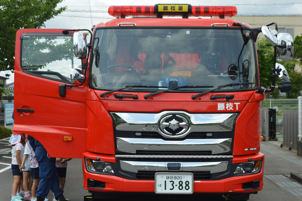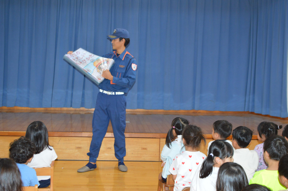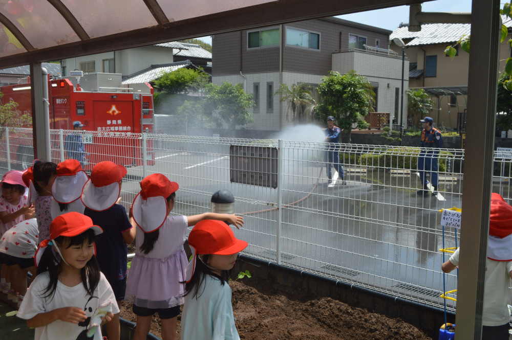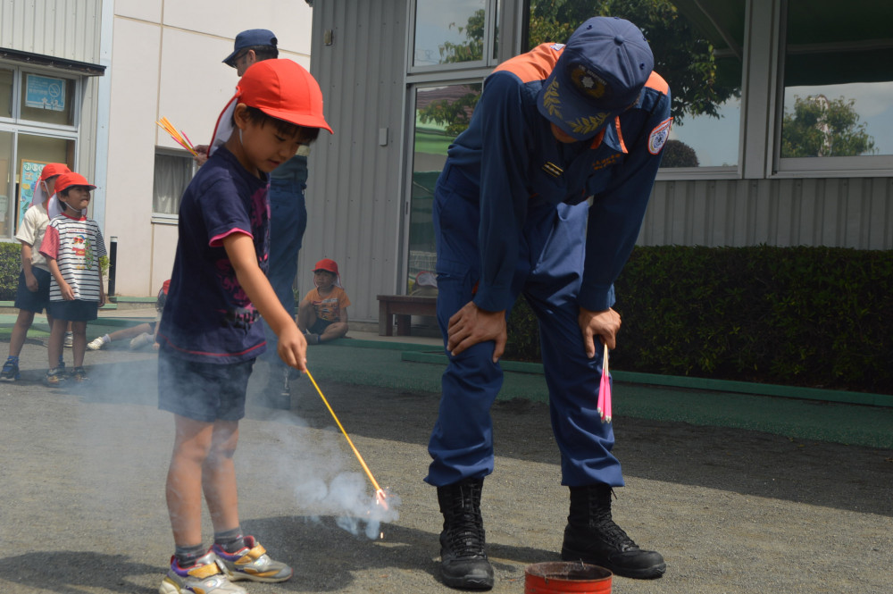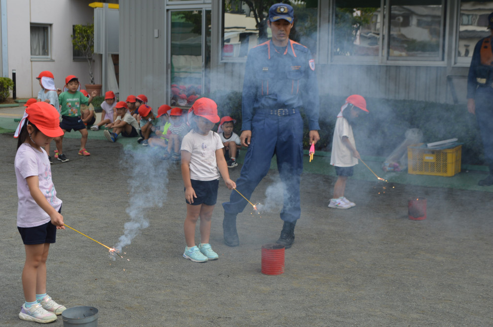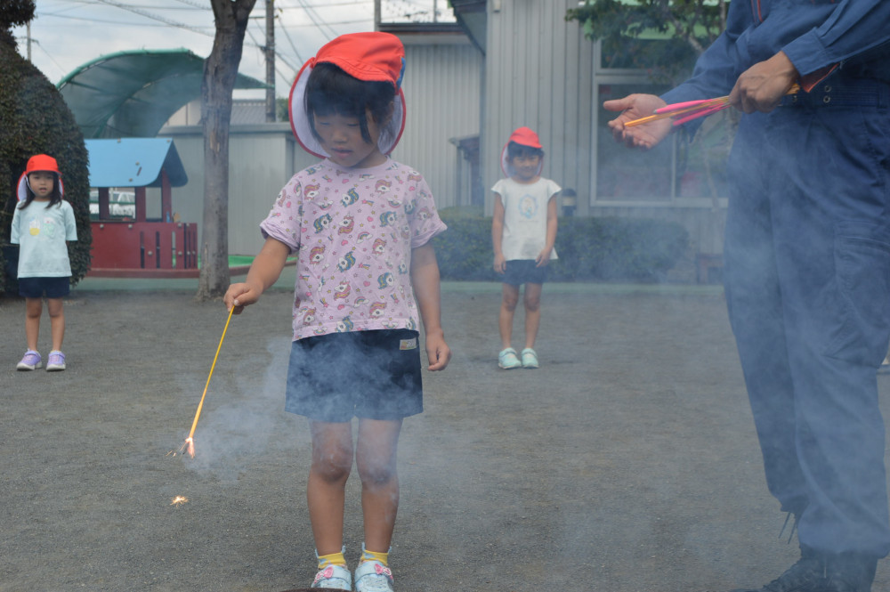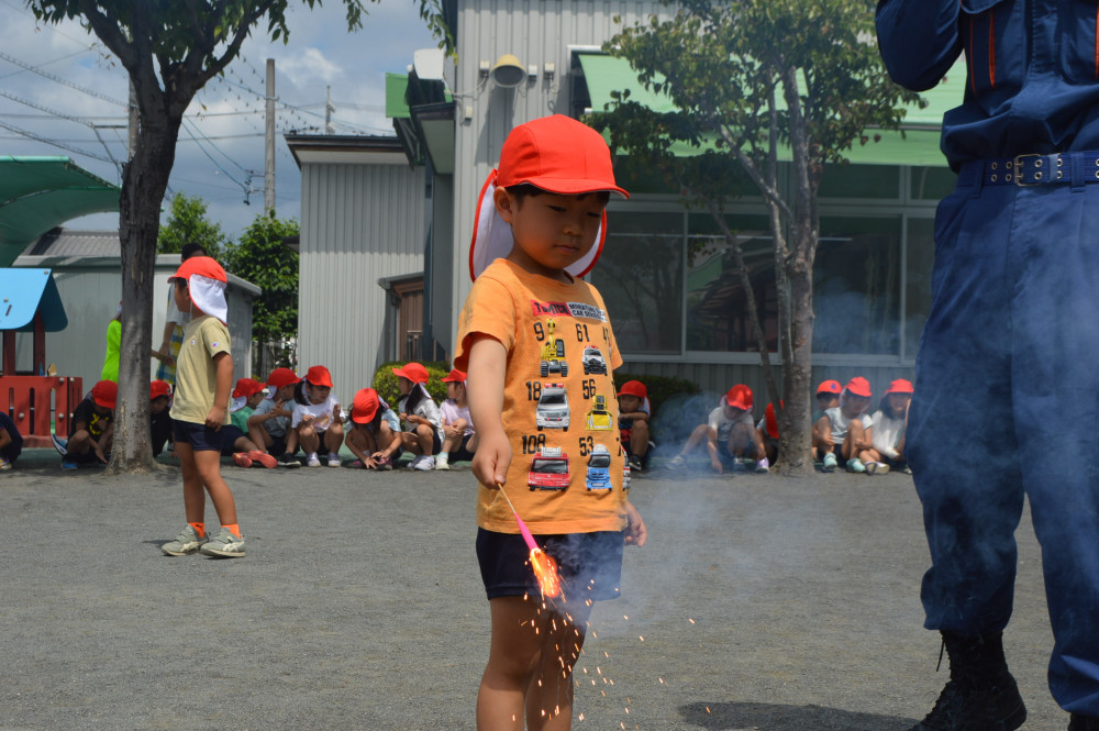 今日は、3,4,5歳児対象に花火教室を行いました。 藤枝消防署の方に、花火の正しい行い方を教えてもらいました。