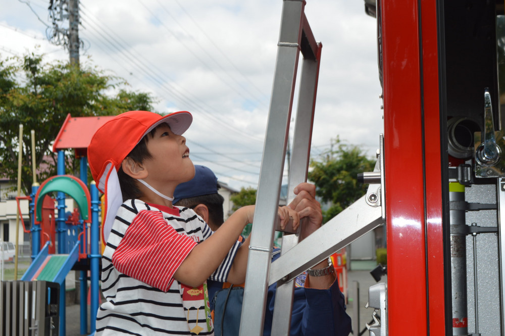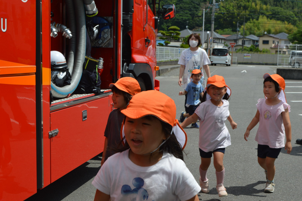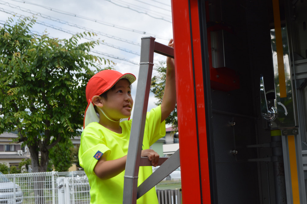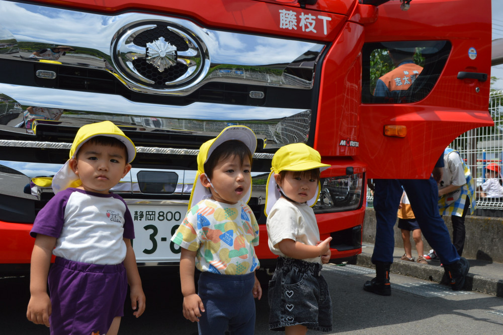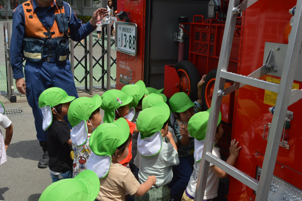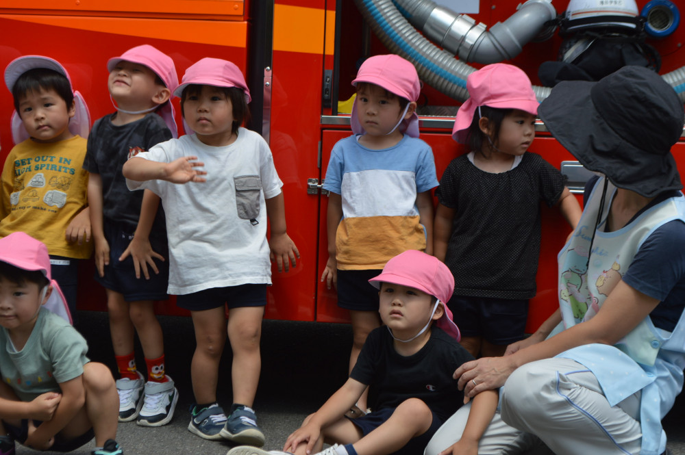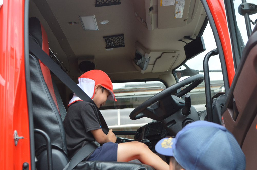その他のクラスの子どもたちも、消防車に乗せてもらったり、大きいタイヤに驚いたり、車についている色々な道具や装置に興味津々に消防車を見せてもらいました。