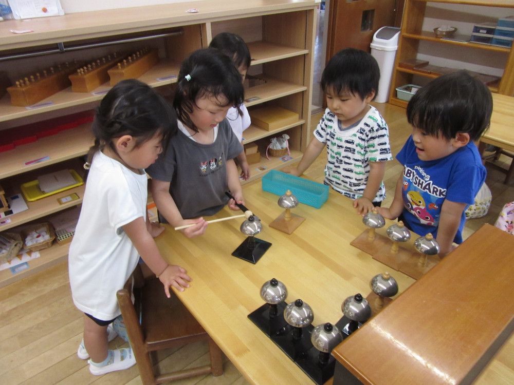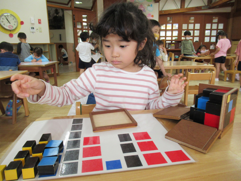 - 幼児が感覚(視覚・聴覚・触覚)を通して言葉を獲得できるようにわかりやすい系統的な教具・教材が用意されていて、楽しく関われるように工夫されています。